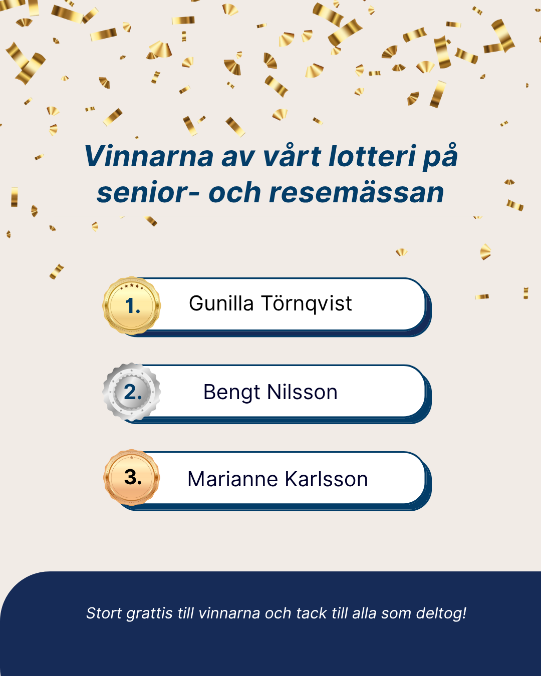 Ett stort grattis till Gunilla Törnqvist, Bengt Nilsson och Marianne Karlsson – vinnarna i vårt lotteri på Senior- och resemässan!